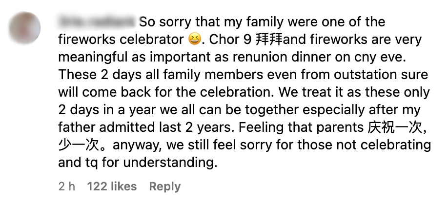 Dia turut memberitahu dia tidak mengetahui tentang sambutan berkenaan. Bagaimanapun, dia sedikit kesal dengan teguran netizen yang menggunakan perkataan kasar selepas dia membuat hantaran mengenai pembakaran mercun terbabit.