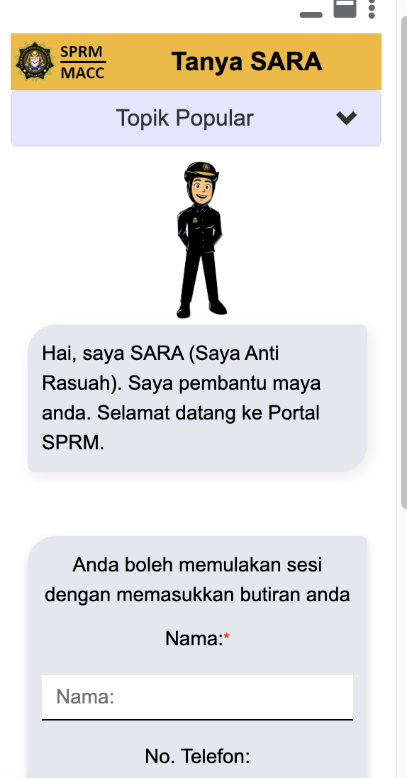 Suruhanjaya Pencegahan Rasuah Malaysia (SPRM) telah memperkenalkan avatar pegawai maya pertamanya yang dibangun menggunakan teknologi kecerdasan buatan (AI), dikenali sebagai 'SARA'