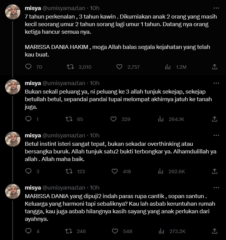 Tambahnya dalam sebuah tweet, wanita itu mendedahkan bekas suaminya pernah bercinta dengan perempuan yang menjadi punca rumah tangganya retak.