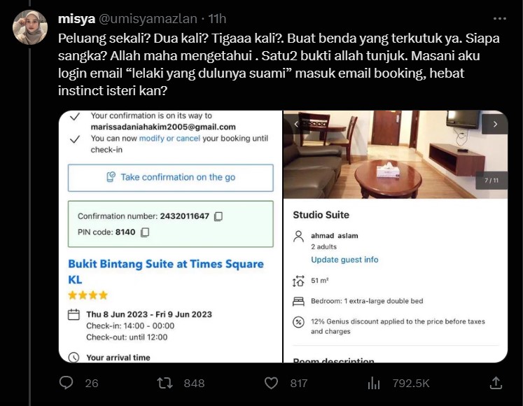 Apa yang mengejutkan wanita tersebut menemui e-mel yang menunjukkan penempahan hotel oleh bekas suaminya bersama perempuan berumur 18 tahun itu.