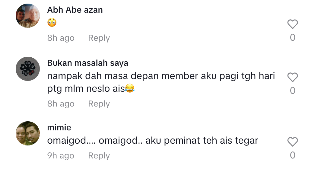 "Abang minat teh tarik. Pagi petang siang malam teh tarik, teh ais. Teh ais dalam kereta sentiasa ada. Habis je teh ais, sambung beli lagi," katanya.