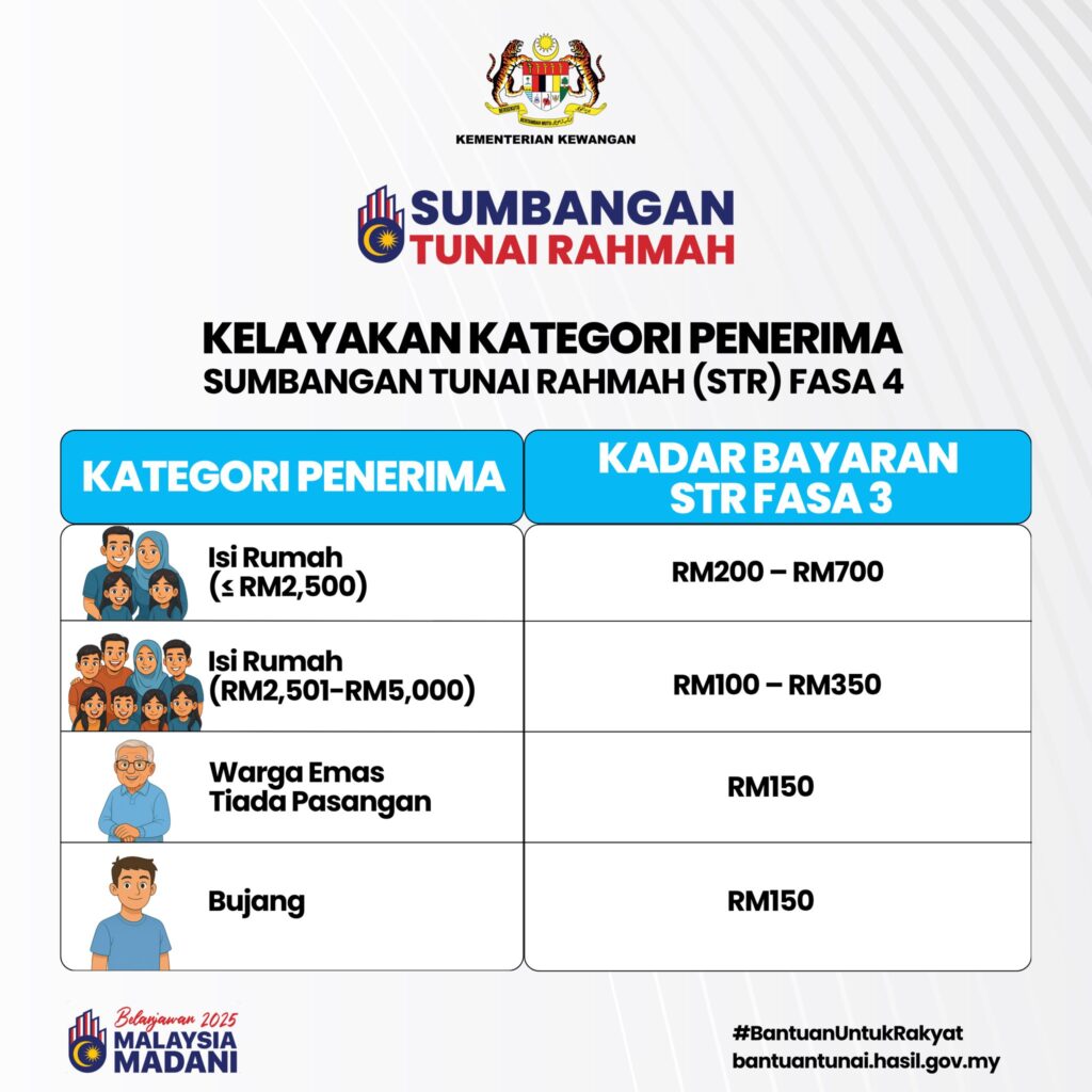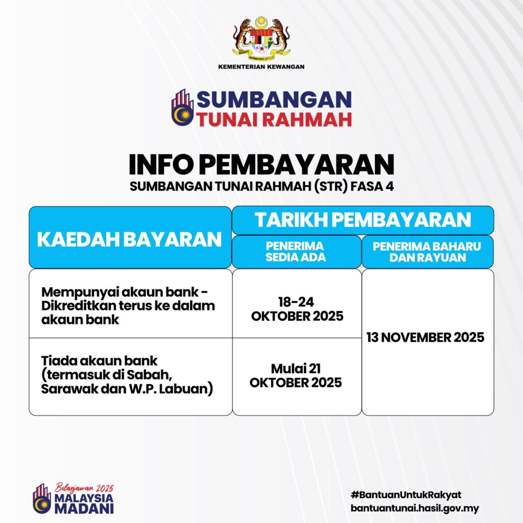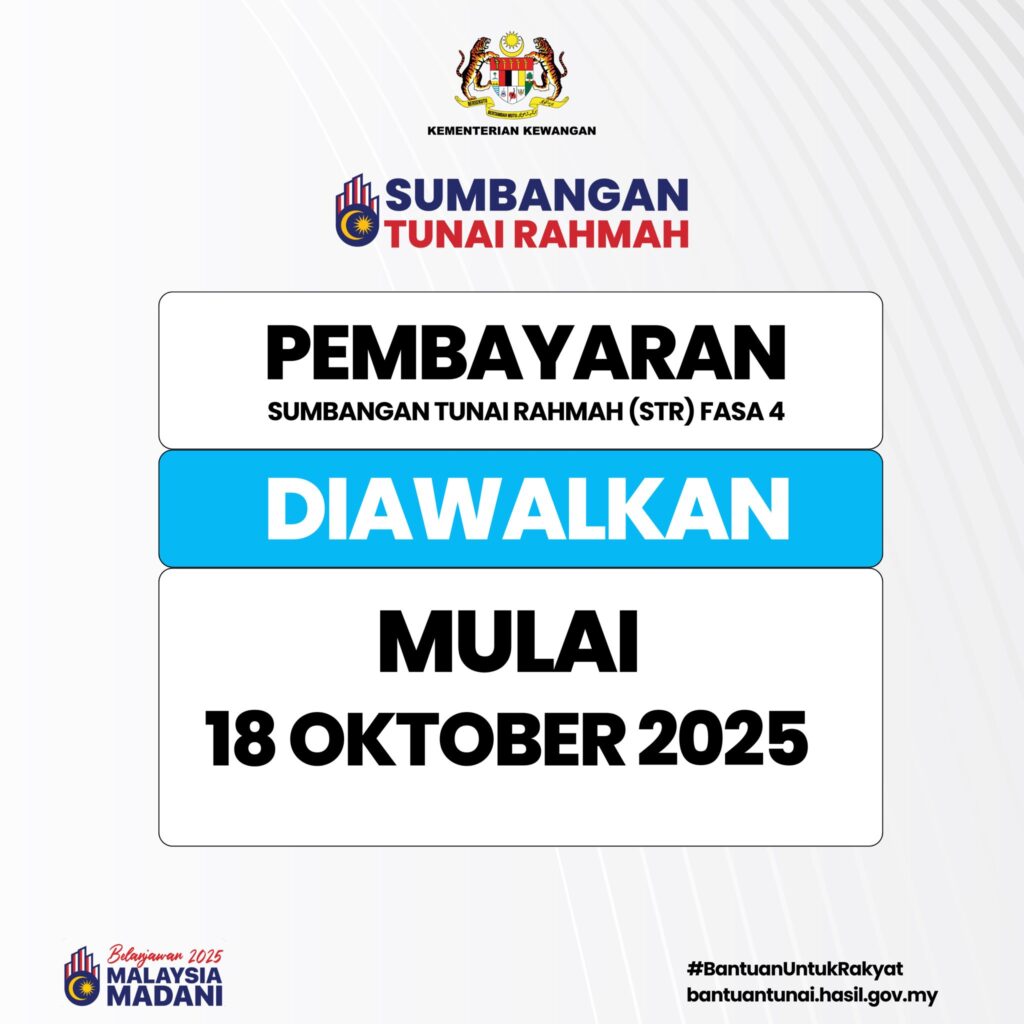 Berita gembira buat penerima Sumbangan Tunai Rahmah (STR), kerajaan mengumumkan bahawa bayaran bagi Fasa 4 akan diawalkan bermula 18 Oktober 2025 ini!