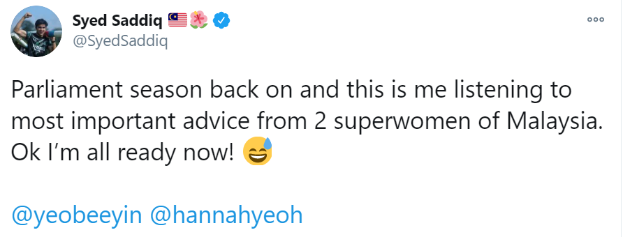 "Musim parlimen kembali dan ini adalah saya mendengar nasihat yang paling penting dari 2 wanita hebat Malaysia. Ok saya sudah bersedia sekarang!"