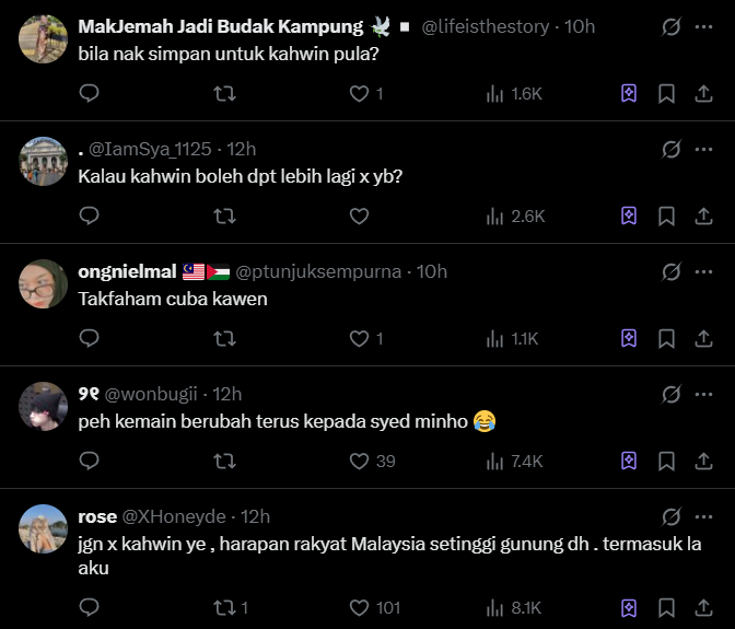 Menerusi tinjauan di bahagian komen pada hantarannya di X, terdapat beberapa pengguna yang memberikan komen mengusik Syed Saddiq yang sentiasa ada bersama Bella Astillah.