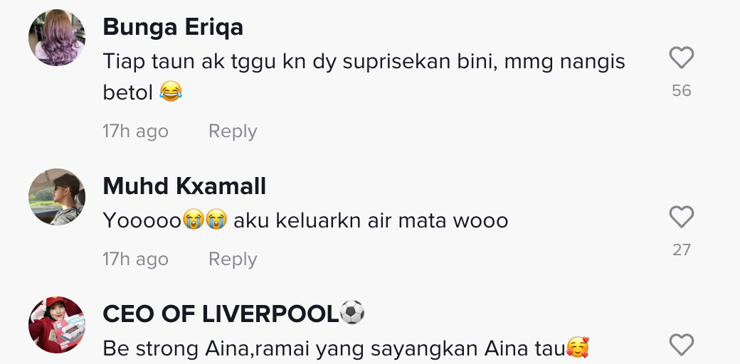 Dokumentari itu ternyata membuatkan Aina tidak berhenti menangis. Aina berkata ianya kejutan paling bermakna buat dirinya.
