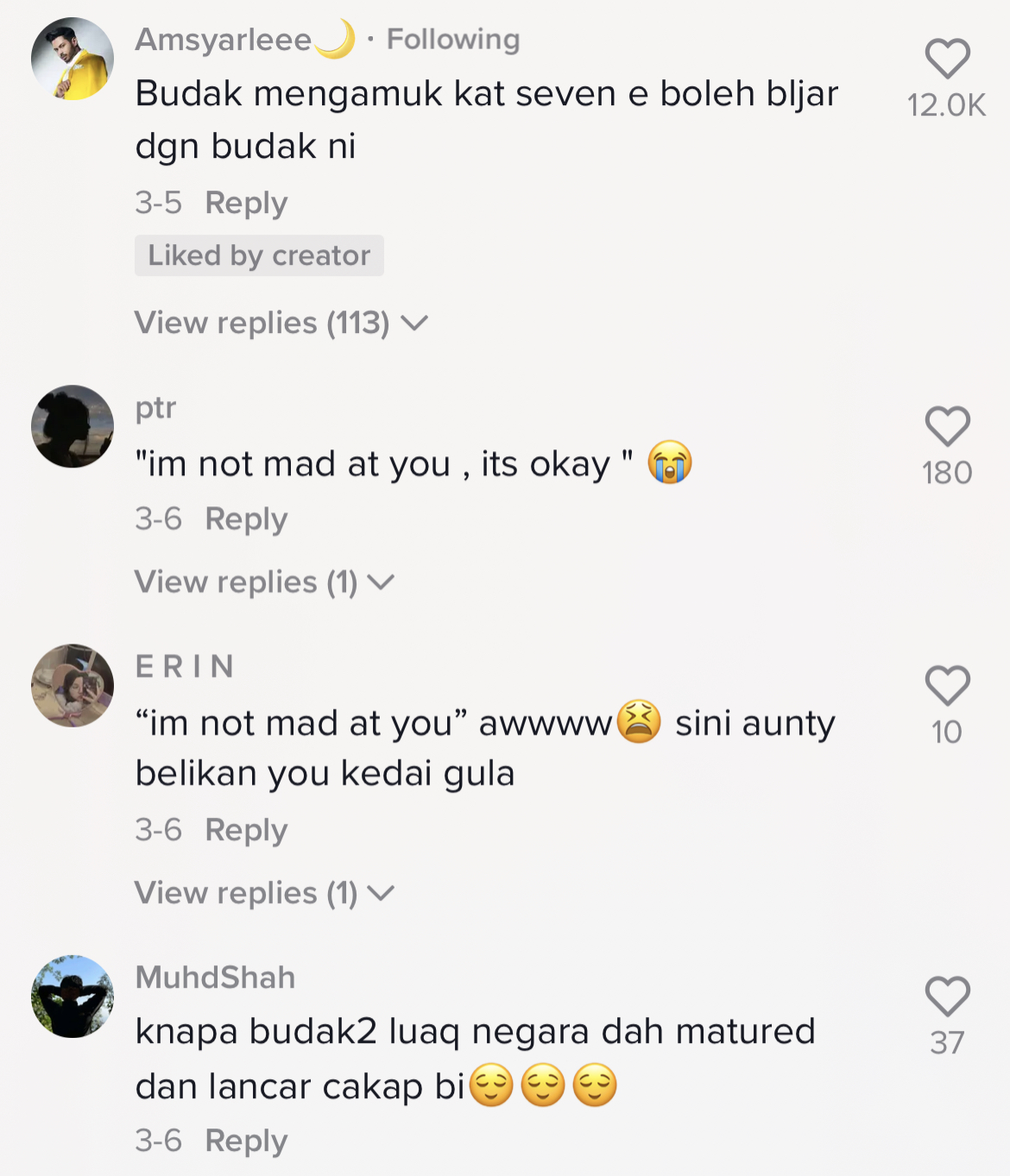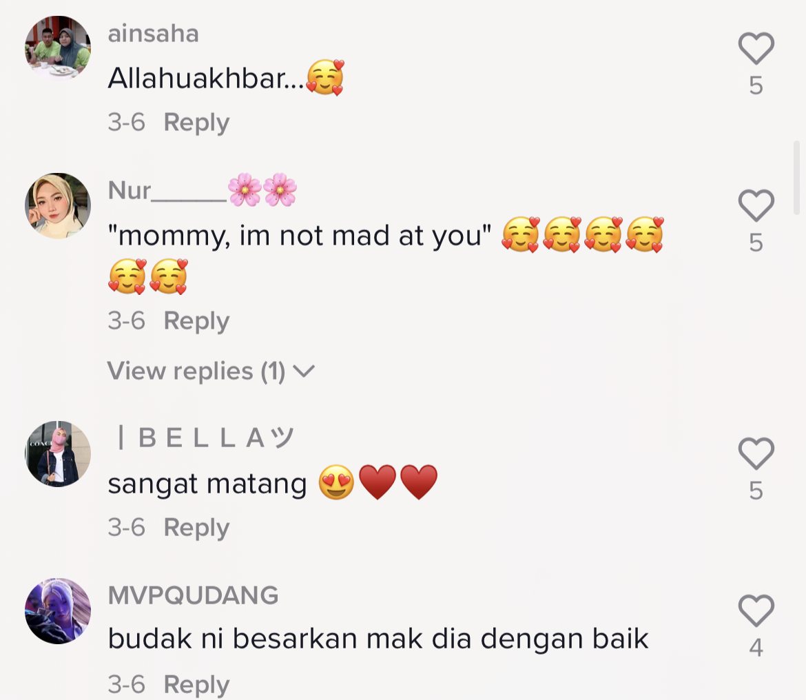 Tinjauan di ruangan komen mendapati rata-rata warganet turut tersentuh dengan reaksi budak lelaki itu bercakap lembut dan memujuk ibunya.