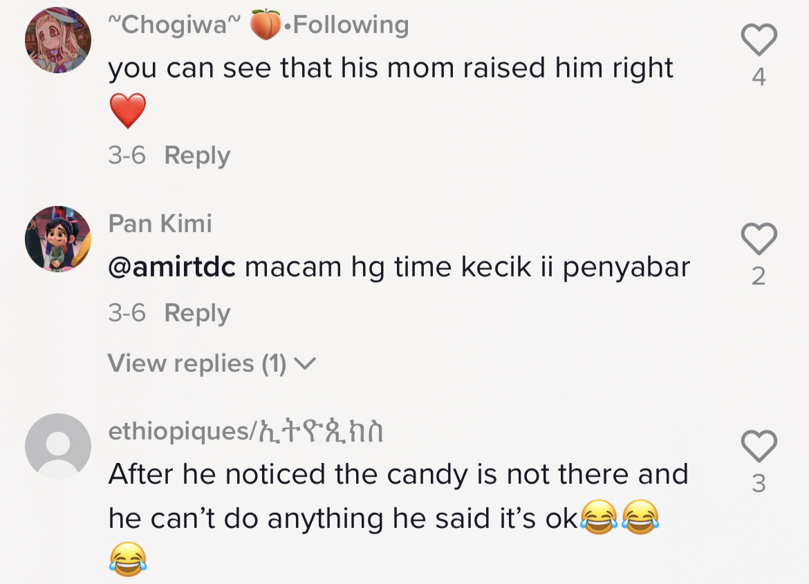 Berbeza pula dengan video yang tular di TikTok baru-baru ini berkenaan reaksi seorang budak lelaki apabila ibunya prank gula-gulanya habis telah membuatkan ramai tersentuh.