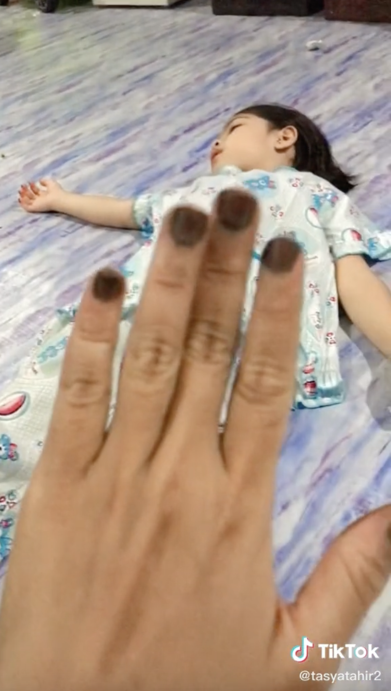 Menerusi video yang dimuat naik oleh @tasyatahir2 di TikTok, kelihatan rakaman menunjukkan seorang budak perempuan sedang tidur dengan kukunya yang telah dipakaikan inai.