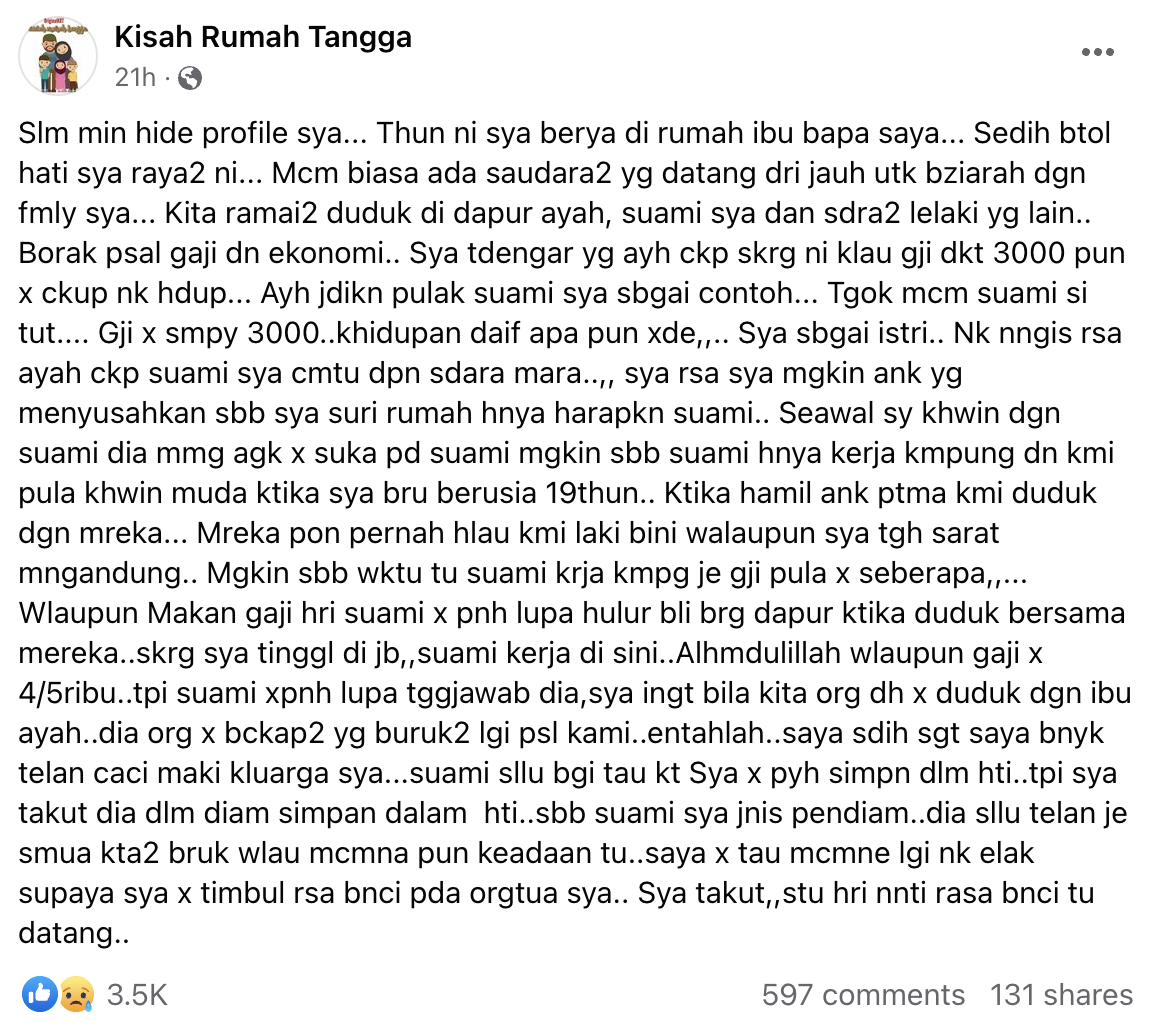 "Saya terdengar yang ayah cakap sekarang ni kalau gaji dekat RM3,000 pun tak cukup nak hidup. Aayah jadikan pula suami saya sebagai contoh. Tengok macam suami si tut… gaji tak sampai RM3,000 kehidupan daif apa pun tak ada. Saya sebagai isteri nak nangis rasa ayah cakap suami saya camtu depan sedara mara," tulisnya.