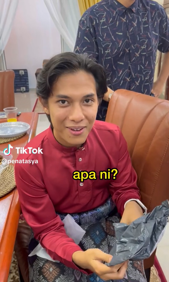 Menerusi video yang dimuat naik oleh @penatasya di TikTok, kelihatan seorang lelaki sedang beraya bersama keluarganya di ruang tamu rumahnya.
