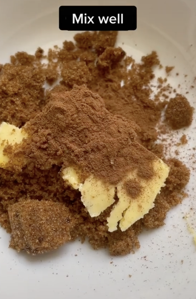 1. Masukkan salted butter, gula perang dan serbuk kayu manis ke dalam mangkuk dan kacau ia sehingga sebati.