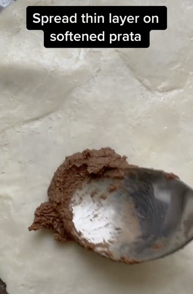 2. Kemudian, sapukan adunan gula perang, salted butter dan serbuk kayu manis tadi ke atas doh instant paratha yang telah dilembutkan.