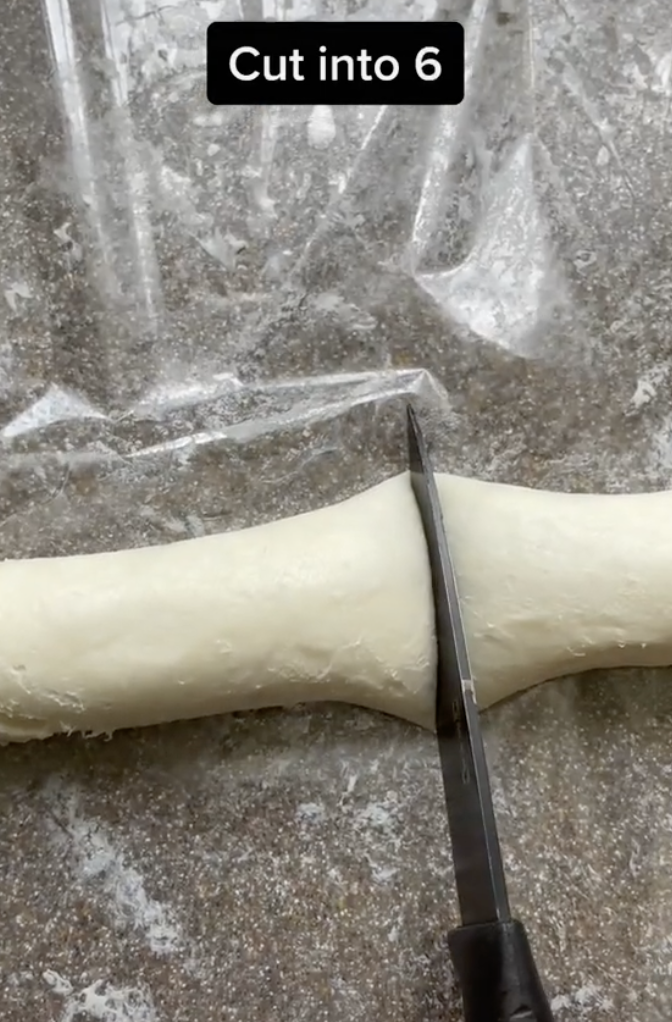 3. Gulungkan doh tersebut seperti di dalam gambar. Seterusnya potong ia sehingga menjadi enam bahagian.