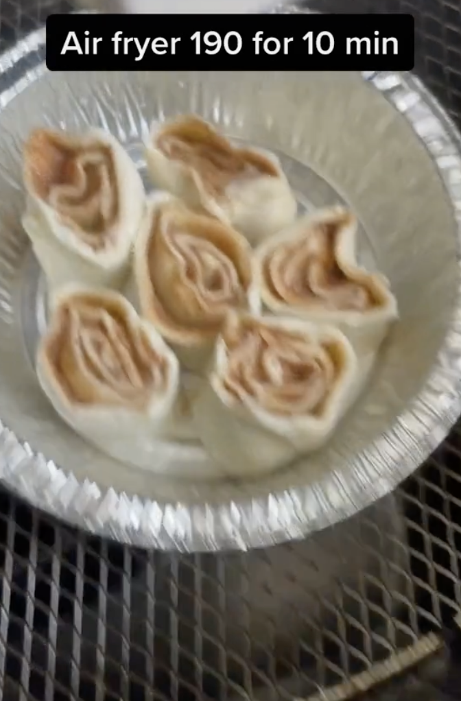 4. Letakkan gulungan doh tadi ke dalam bekas tahan panas. Kemudian, bakar di dalam air fryer dengan suhu 190 darjah celsius selama 10 minit.