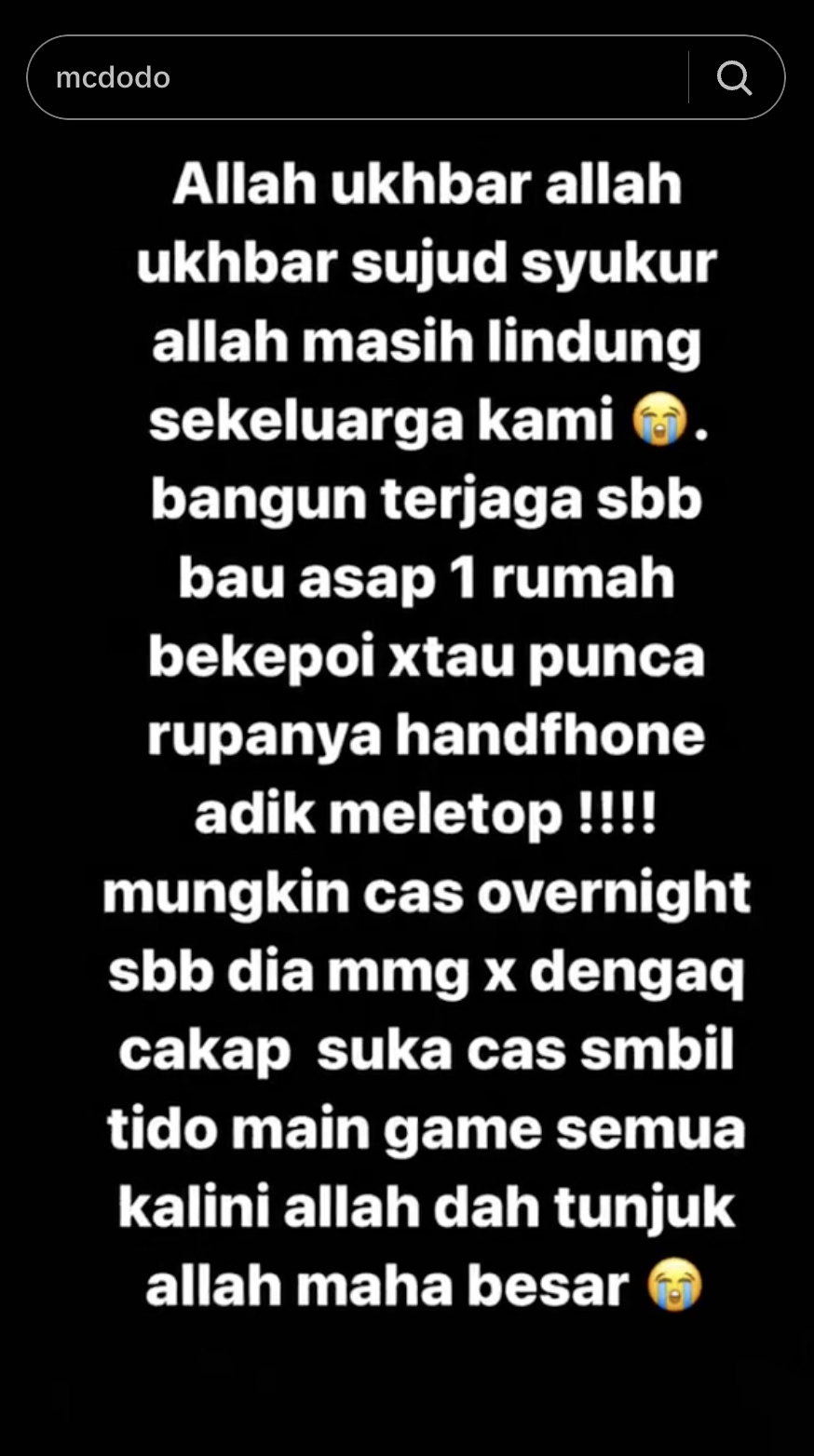 Mereka kemudian mencari puncanya dan mendapati telefon bimbit si adik terbakar dan meletup ketika sedang cas.