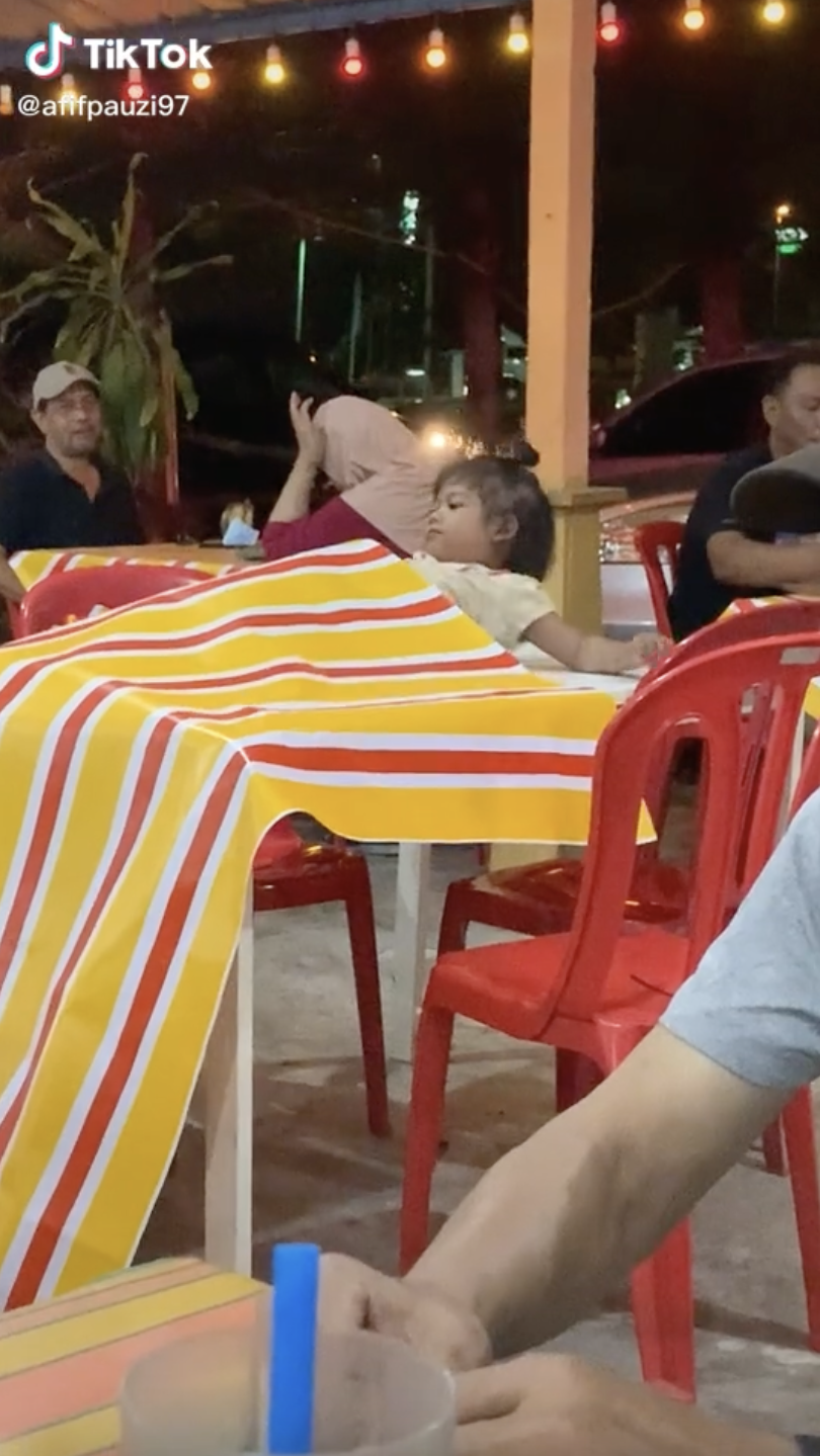 Menerusi video yang dimuat naik oleh @afifpauzi97 di TikTok, kelihatan seorang budak perempuan sedang berbaring di atas meja sebuah kedai makan yang tidak dikenal pasti.