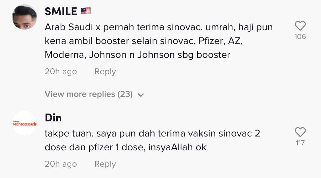 Dia juga menjelaskan sebenarnya Arab Saudi bukanlah tidak menerima vaksin Sinovac tetapi mereka mempunyai syarat. Menurutnya Arab Saudi menerima vaksin jenis Pfizer, Johnson & Johnson dan Moderna. Difahamkan, selain daripada itu anda perlu mendapatkan booster.