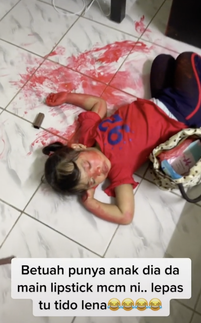 Dah habis main lipstick sampai penuh dekat lantai, boleh pula dia tertidur
