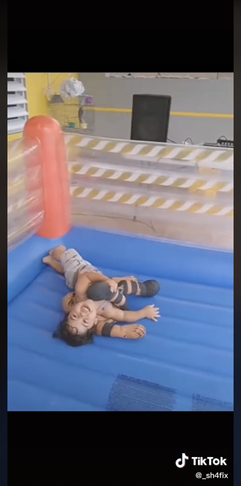 Kanak-kanak itu kemudian memulakan pelbagai gaya yang tidak ubah seperti WWE. Dia mula meloncat dan menumbuk patung yang ada di dalam gelanggang tersebut.