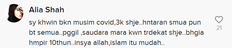 Sementara itu, tinjauan di ruangan komen mendapati rata-rata netizen juga ramai berkongsi pengalaman sama mereka semasa berkahwin di musim pandemik ini.