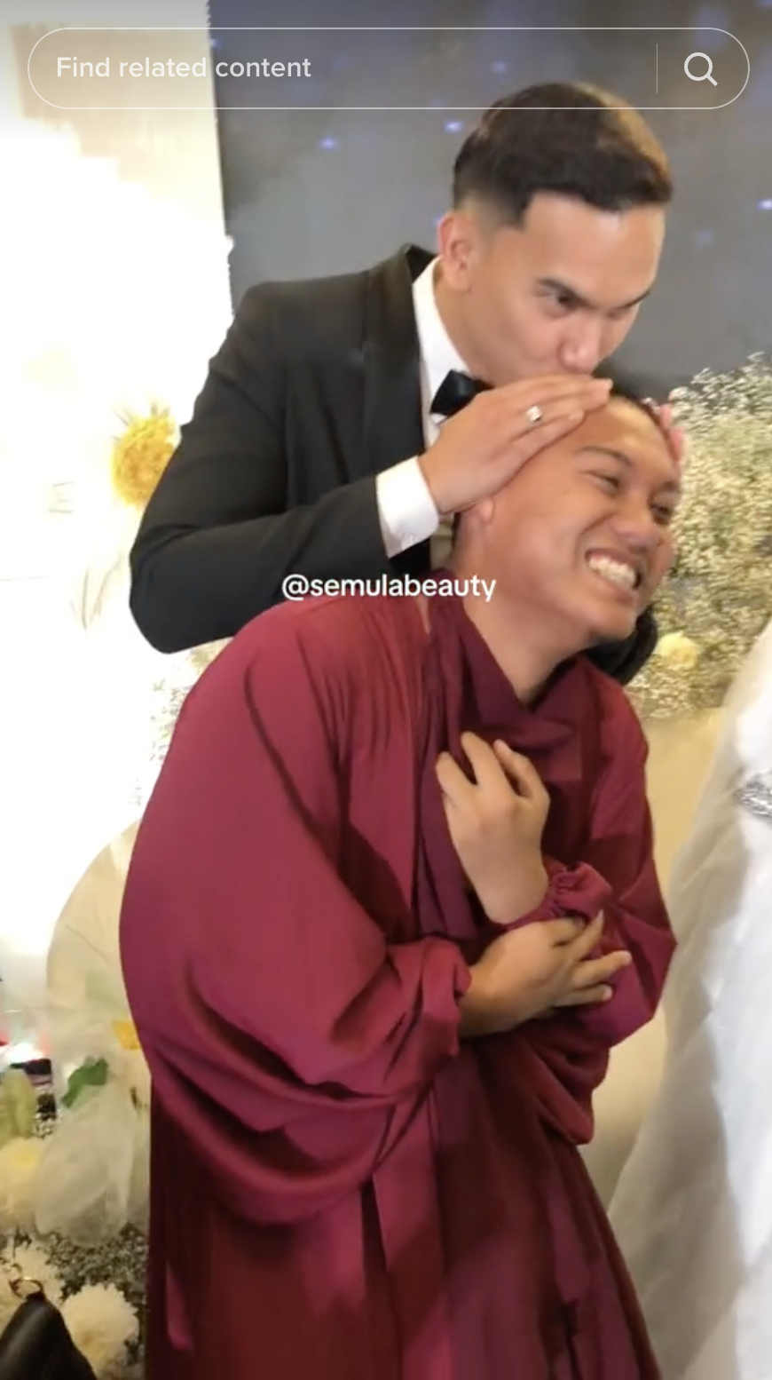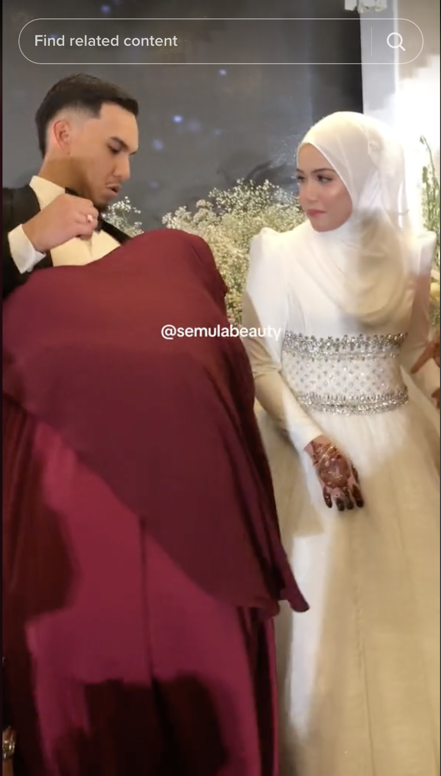 Namun, lain pula terjadi semasa majlis bersalaman bersama pengantin apabila seorang individu dilihat tiba-tiba memeluk MK yang membuatkan si isteri juga terkejut melihatnya.