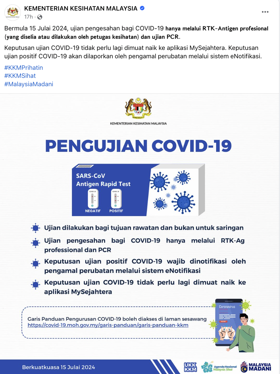 Menurut KKM, ujian pengesahan bagi Covid-19 hanya akan dilakukan melalui kit ujian pantas antigen (RTK-Ag) profesional yang diselia atau dilakukan petugas kesihatan serta ujian tindak balas rantai polimerase (PCR).
