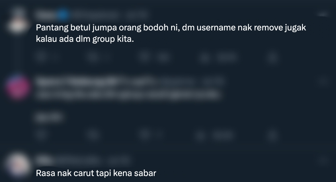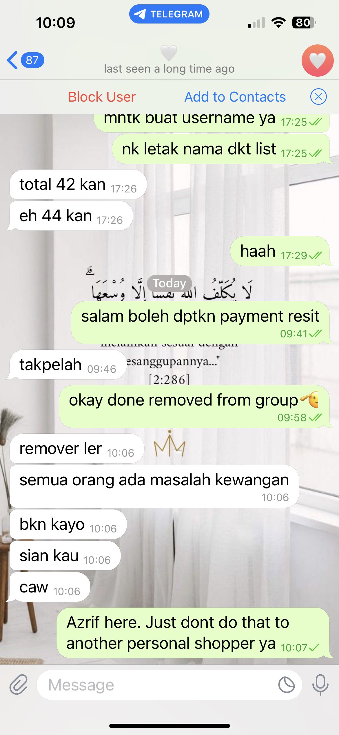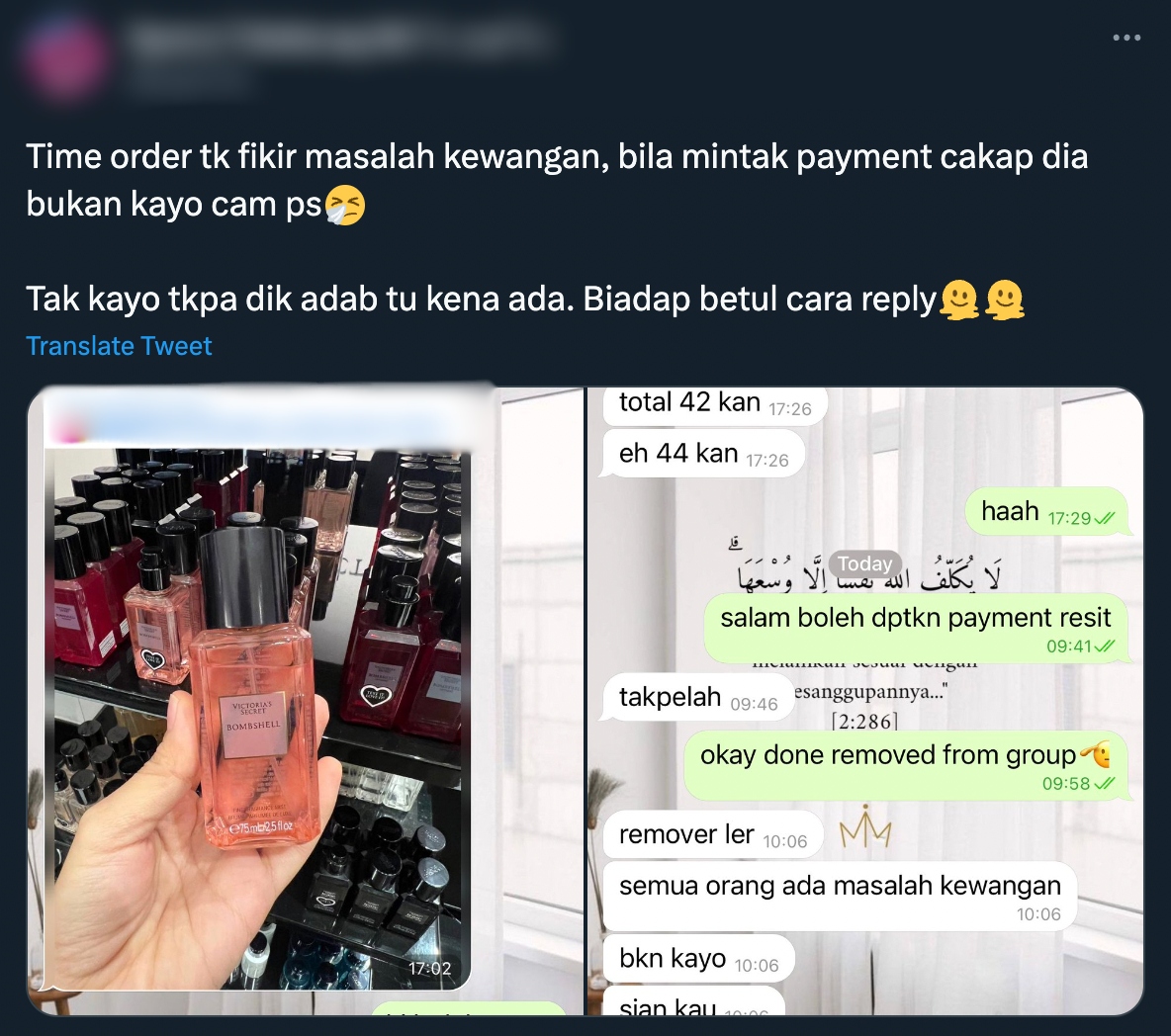 Namun, apabila wanita itu meminta bukti bayaran, pelanggan itu mula memberitahu ada masalah kewangan. Situasi itu membuatkan dia marah dan memberitahu untuk mengeluarkannya daripada group berkenaan.