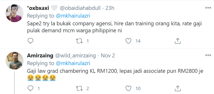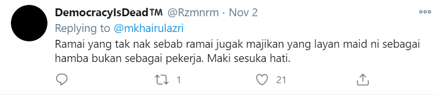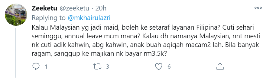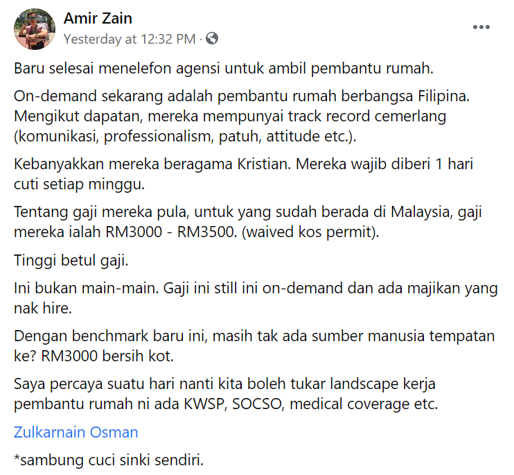 Menerusi posting tersebut, dia memberitahu bahawa dia mendapat tahu harga sebenar gaji mereka selepas menelefon salah satu agensi untuk mengambil pembantu rumah.