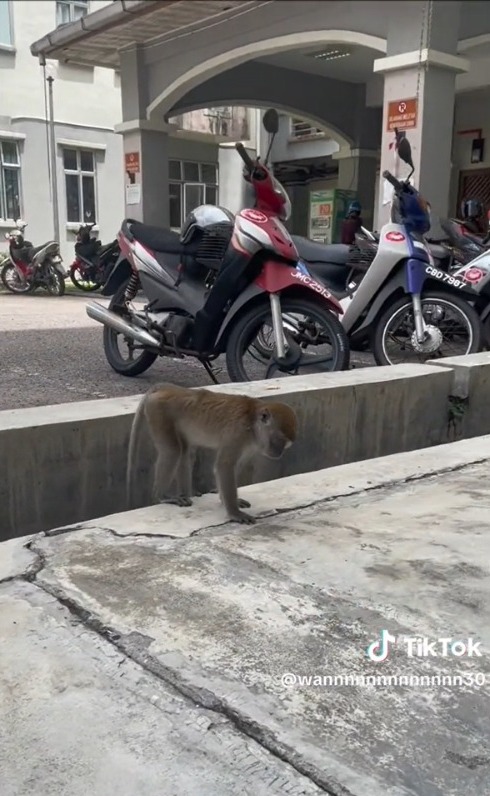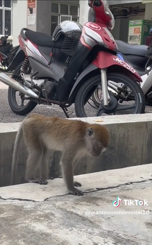 Monyet itu dilihat langsung tidak bergerak di sebuah longkang dan pelajar-pelajar tersebut kelihatan turut meniru gaya berkenaan.