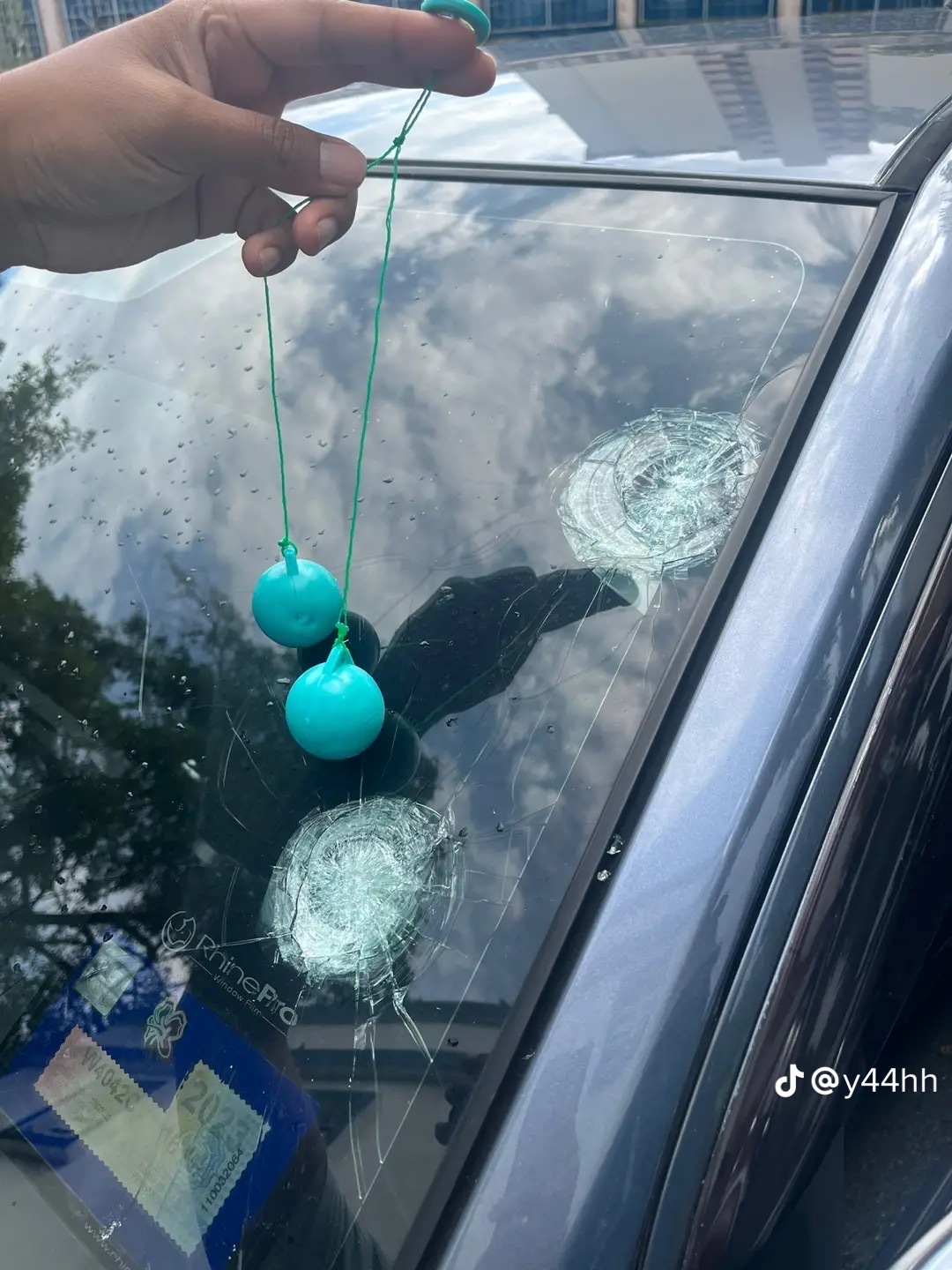 Difahamkan, keadaan itu terjadi selepas terkena permainan yang dimain seorang kanak-kanak. Pada awalnya, dia hanya kelihatan dua kesan hentakan saja pada bahagian cermin hadapan