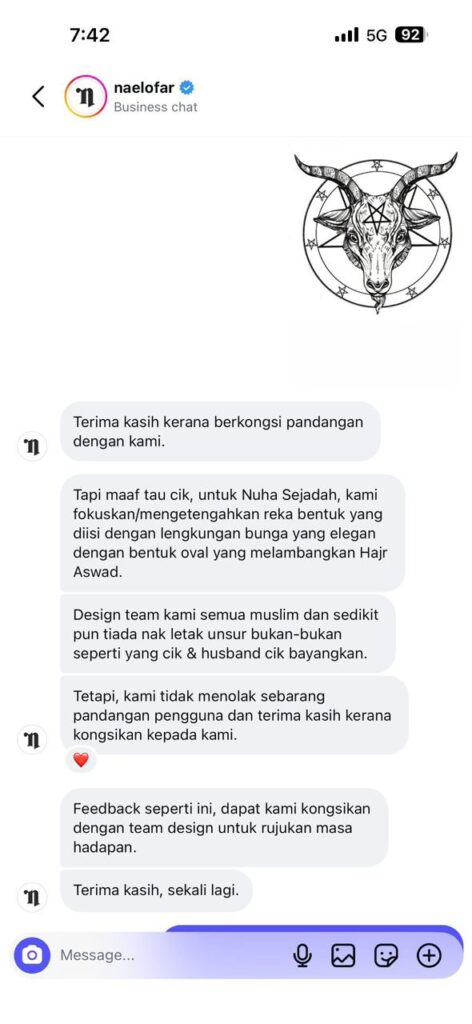Susulan itu, pihak Naelofar tampil memberi penjelasan berhubung dakwaan tersebut dan menafikan bahawa terdapat simbol berkaitan amalan pemujaan syaitan pada produk mereka