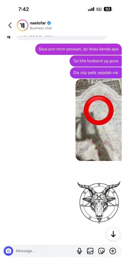 Baru-baru ini, tular di media sosial apabila seorang pengguna mempersoalkan corak pada sejadah keluaran jenama Naelofar yang didakwa mempunyai imej tersembunyi menyerupai kepala kambing, simbol yang sering dikaitkan dengan amalan Baphomet dalam kepercayaan Satanism