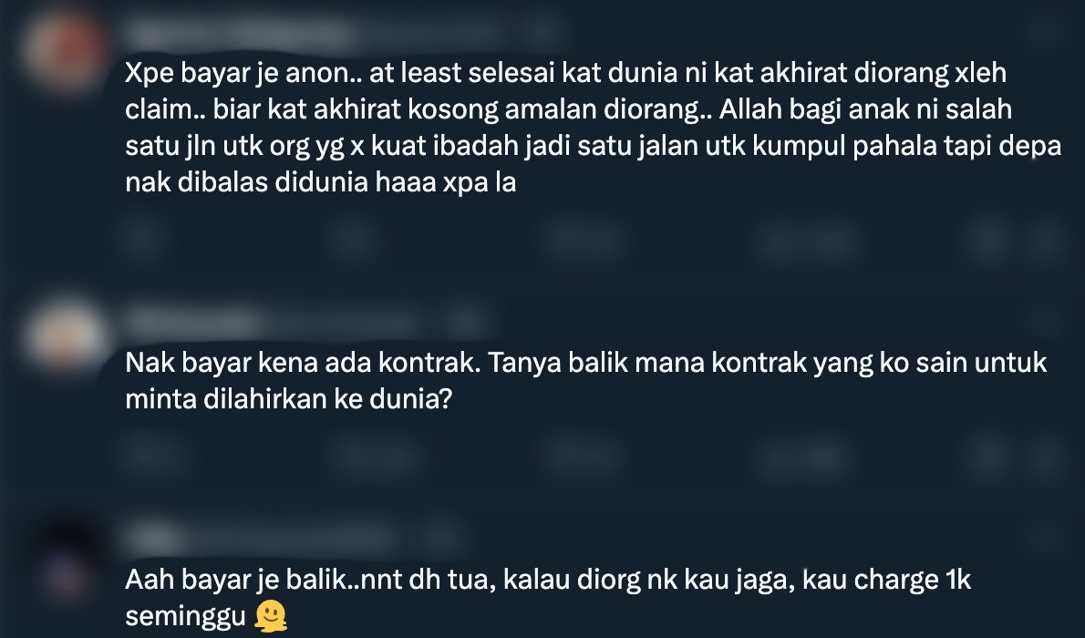 Namun, berbeza pula dengan perkongsian yang tular di laman X ini apabila seorang individu berkongsi ibu bapanya meminta kembali segala hutang kepada anaknya.