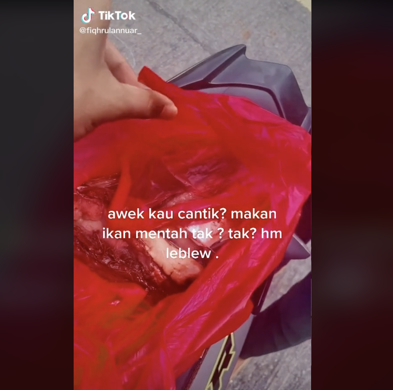 Menerusi video yang dikongsi oleh @fiqhrulannuar_, kelihatan seorang gadis sedang memakan ikan tuna mentah yang kelihatan seperti baru sahaja dibeli dari pasar.