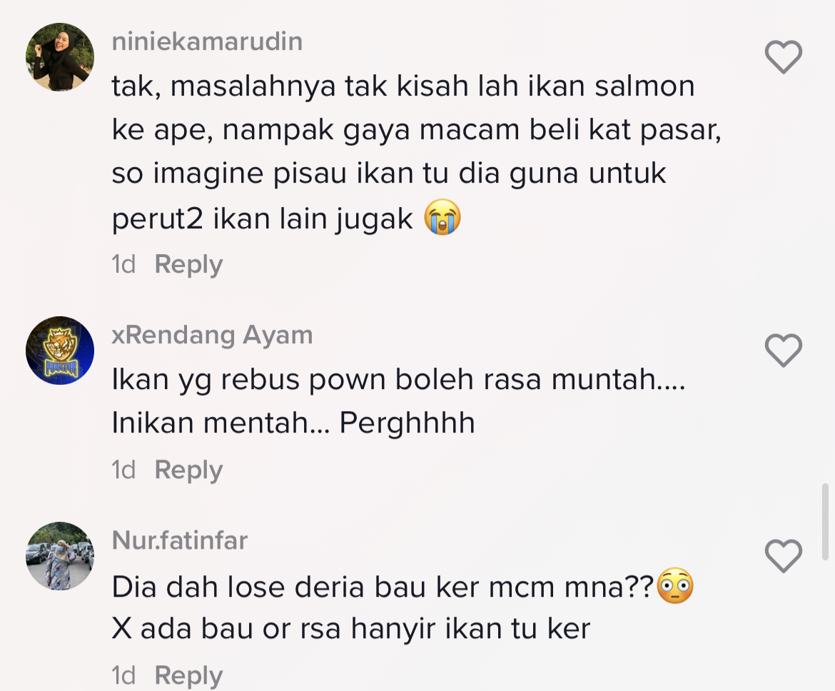 Menerusi video yang dimuat naik oleh @fiqhrulannuar_, gadis itu berkata dia hanya mengambil bahagian ikan yang bersih dan kemudian mencucinya terlebih dahulu sebelum makan.
