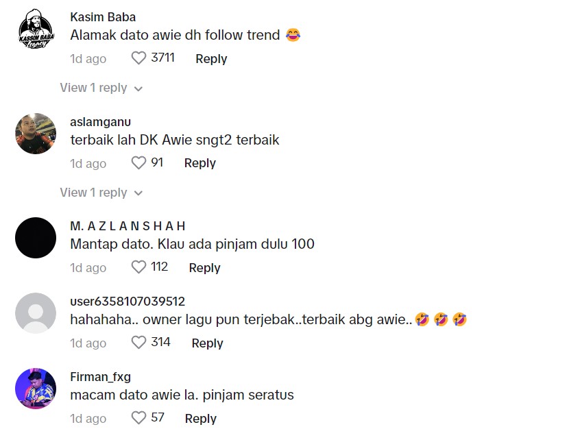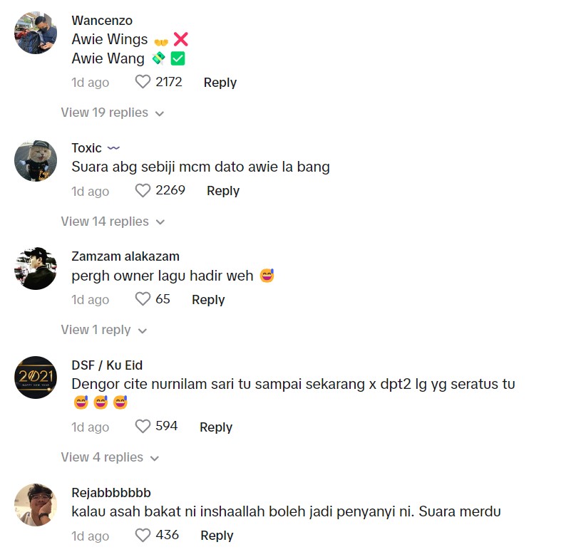 Rata-rata komen yang diberikan netizen di TikTok dilihat berseloroh seolah-olah mereka tidak mengenali Awie disamping memuji nyanyian merdunya itu.