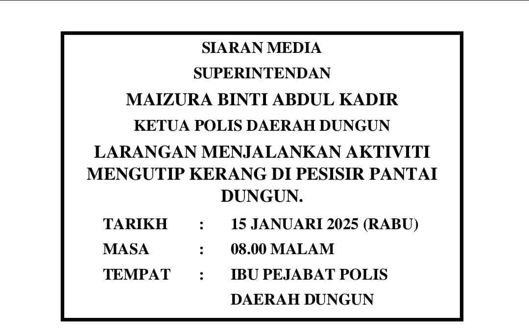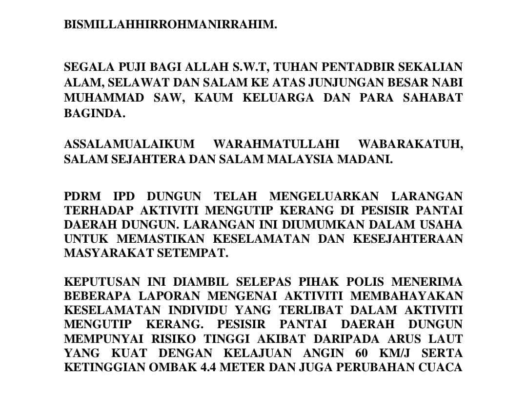 Dalam pada itu, polis mengeluarkan amaran larangan mengutip kerang di pesisir pantai daerah Dungun.