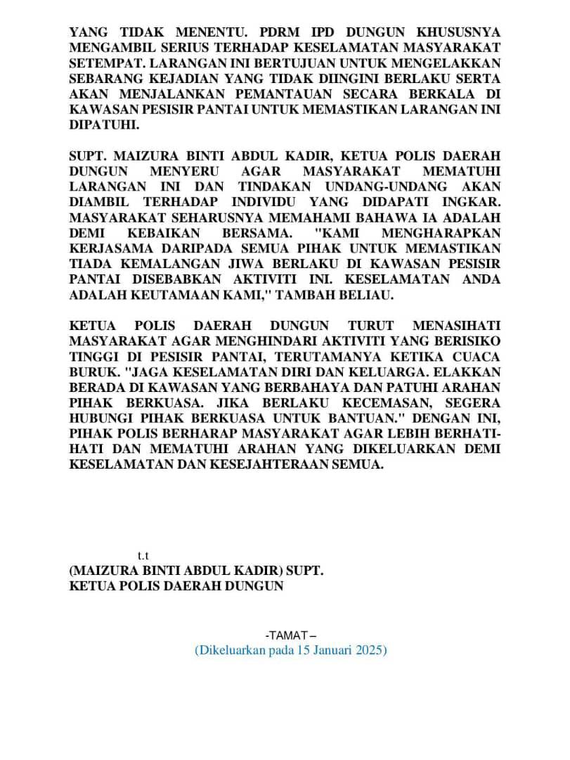Menerusi kenyataan di Facebook, Ketua Polis Daerah Dungun, Sup Maizura Abdul Kadir, berkata larangan ini dibuat selepas pihaknya menerima beberapa laporan mengenai aktiviti berkenaan yang membahayakan individu terlibat.