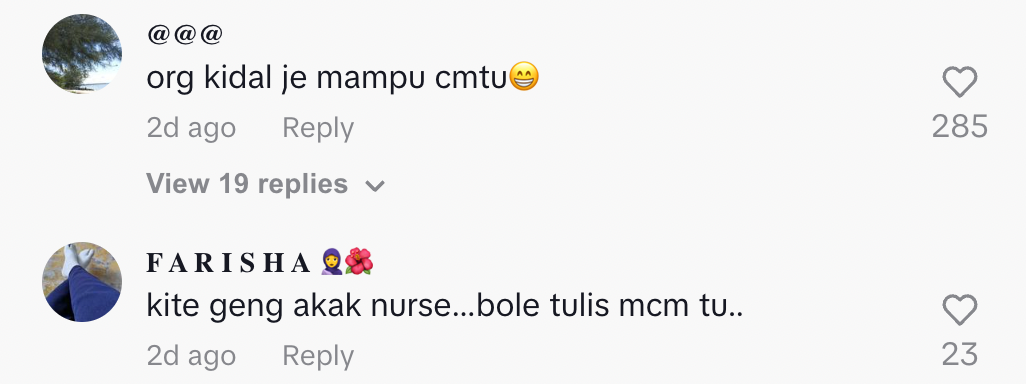 Sementara itu, tinjauan di ruangan komen mendapati netizen turut memuji kelebihan yang ada pada jururawat itu. Malah, tidak kurang juga yang berpendapat hanya golongan kidal yang memiliki bakat berkenaan.
