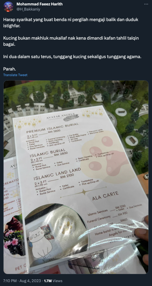 Menerusi ciapan tersebut, kelihatan seorang individu di Twitter berkongsi pakej mengebumikan bangkai kucing mengikut syariat Islam.