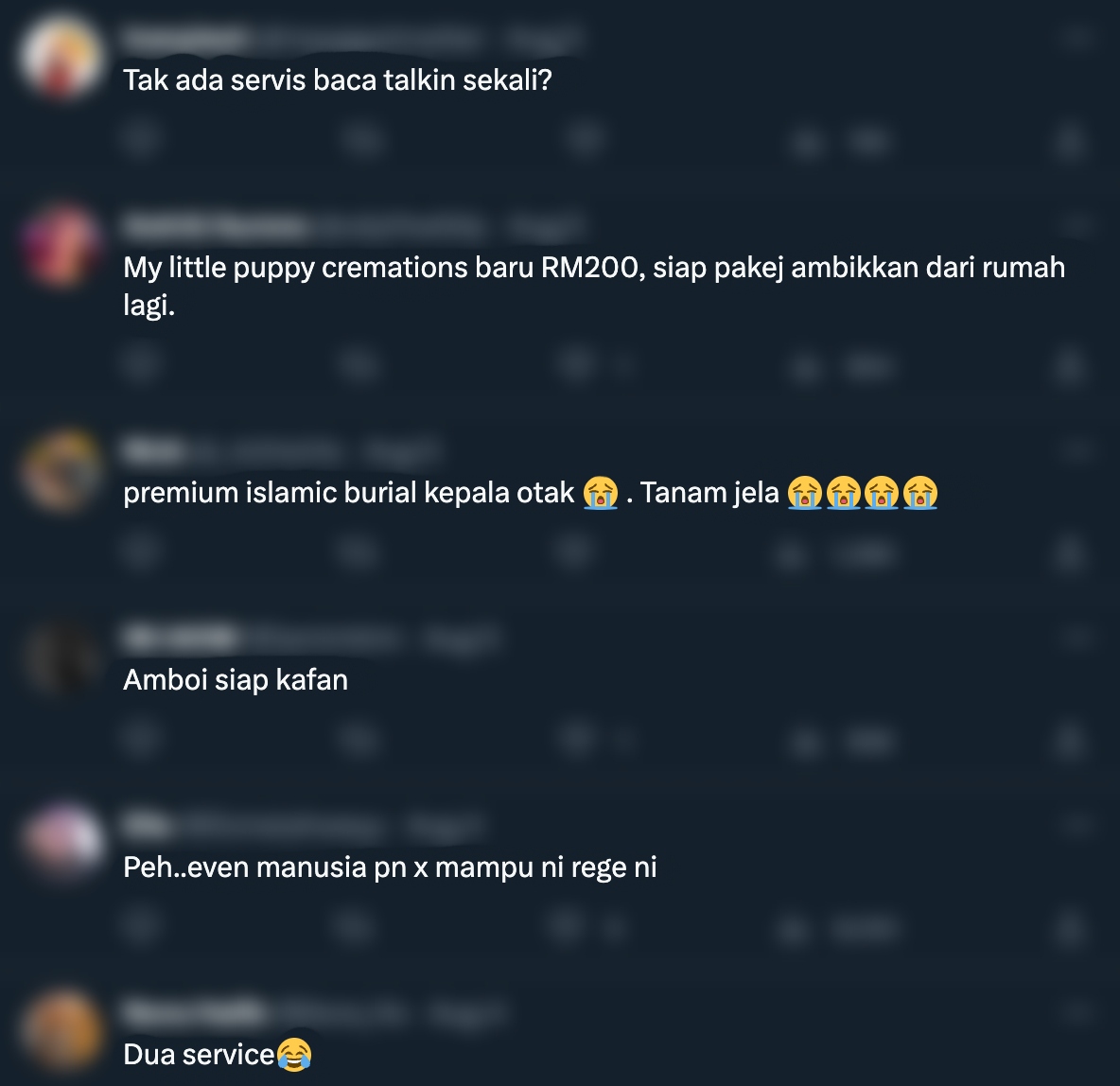 Malah, servis berkenaan turut lengkap dengan kafan, doa dan tapak kubur untuk haiwan peliharaan. Bagi pakej premium pula, mereka ada servis tambahan iaitu bacaan doa, majlis pengebumian, mandi jenazah, botol untuk bulu, gambar kenangan, patung tanah 3D dan video kenangan.