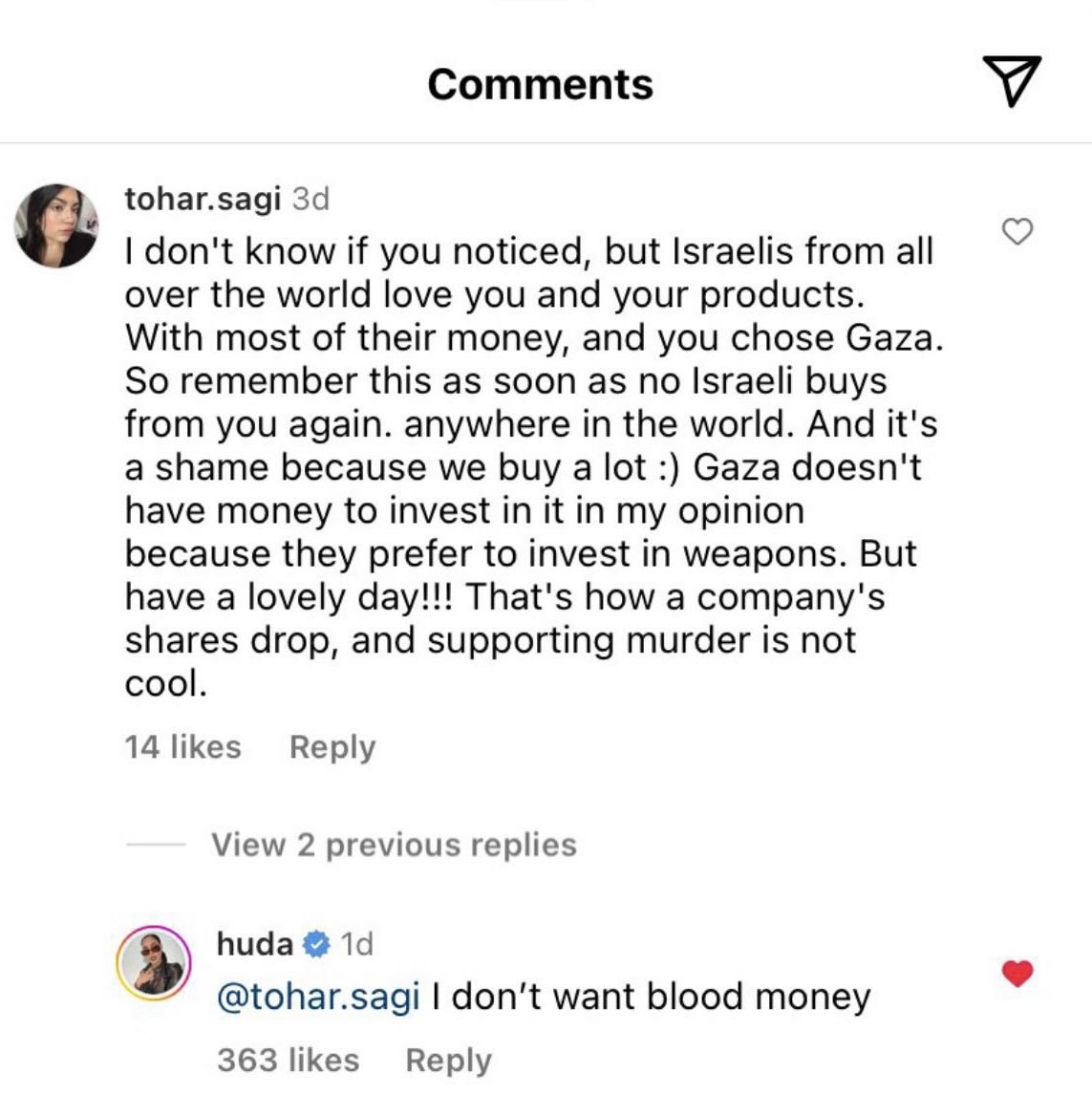 Malah, ada pengikut yang memberikan komen dengan memberitahu mereka tidak mahu membeli produk Huda Beauty lagi.