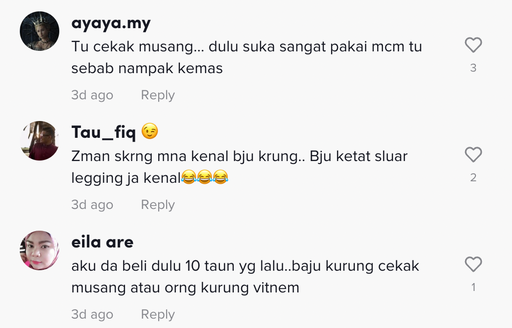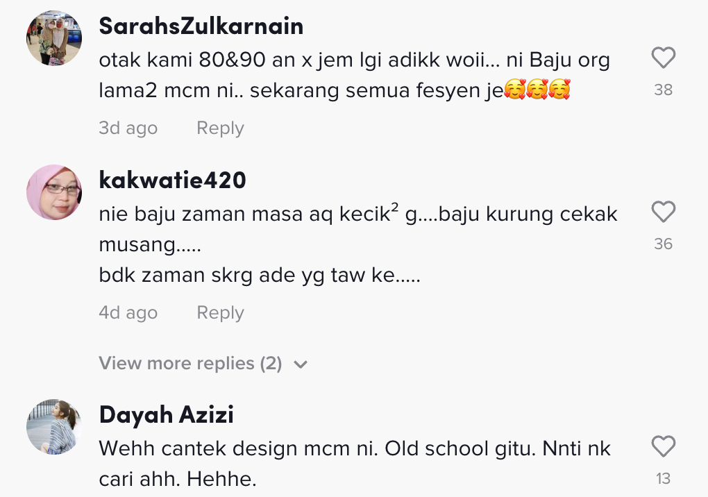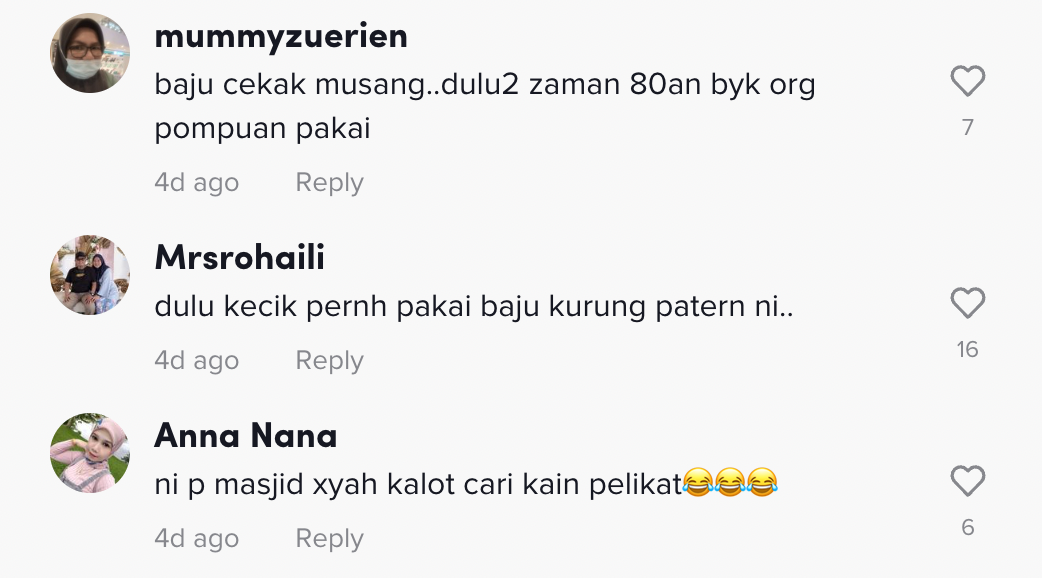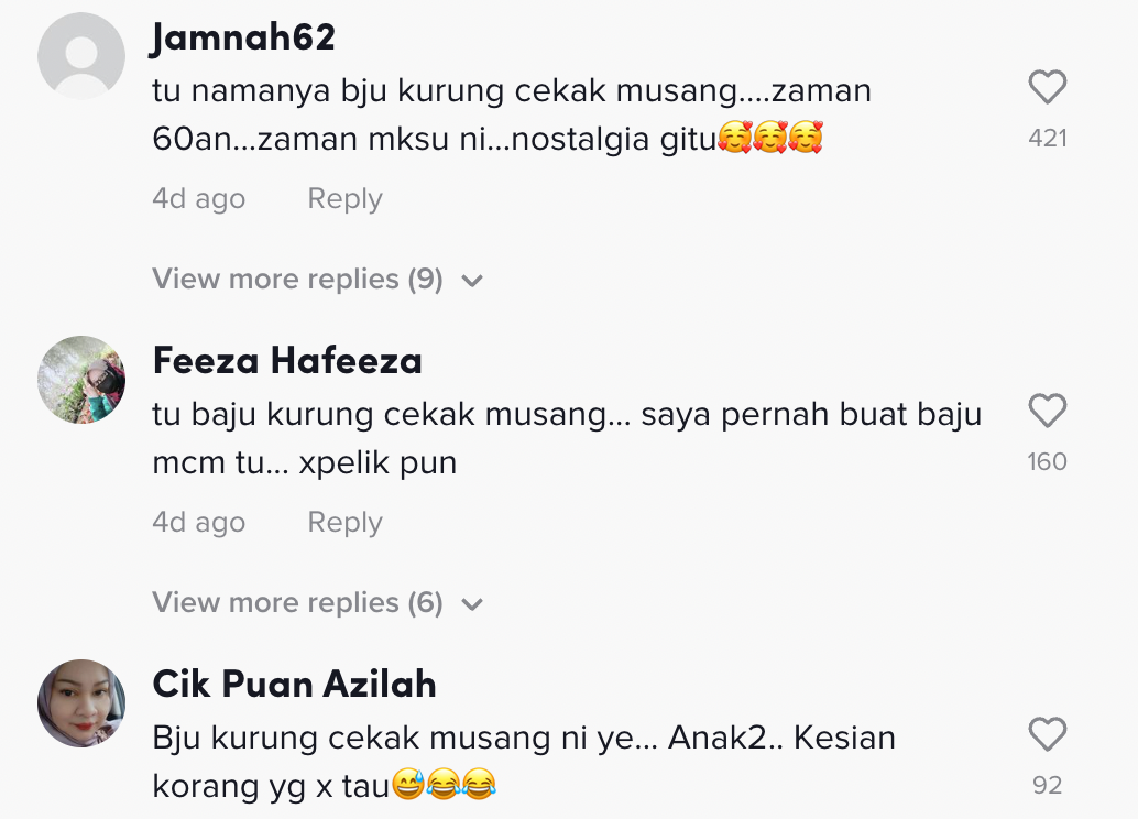 Sementara itu, tinjauan di ruangan komen mendapati rata-rata netizen turut memberitahu bahawa itu adalah baju kurung cekak musang yang popular suatu ketika pada zaman dahulu.
