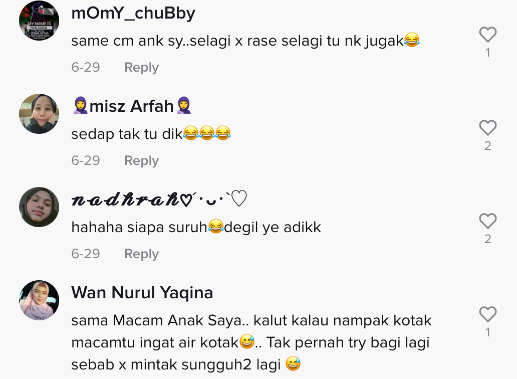 Sementara itu, tinjauan di ruangan komen mendapati rata-rata netizen turut meluahkan rasa terhibur mereka melihat video tersebut. Malah, ada juga yang berkongsi perangai sama anak mereka.