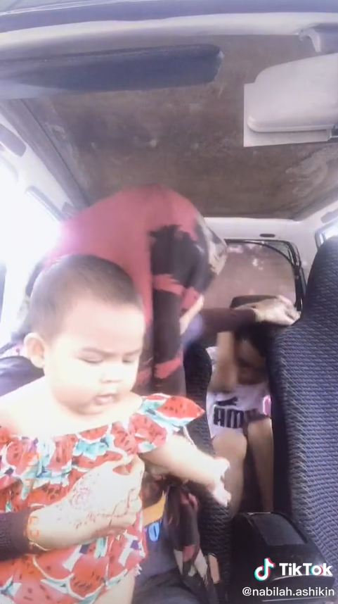 Kanak-kanak itu kemudian dilihat menyanyi sebuah lagu yang telah diubah suai dengan riangnya di bahagian tempat duduk belakang.