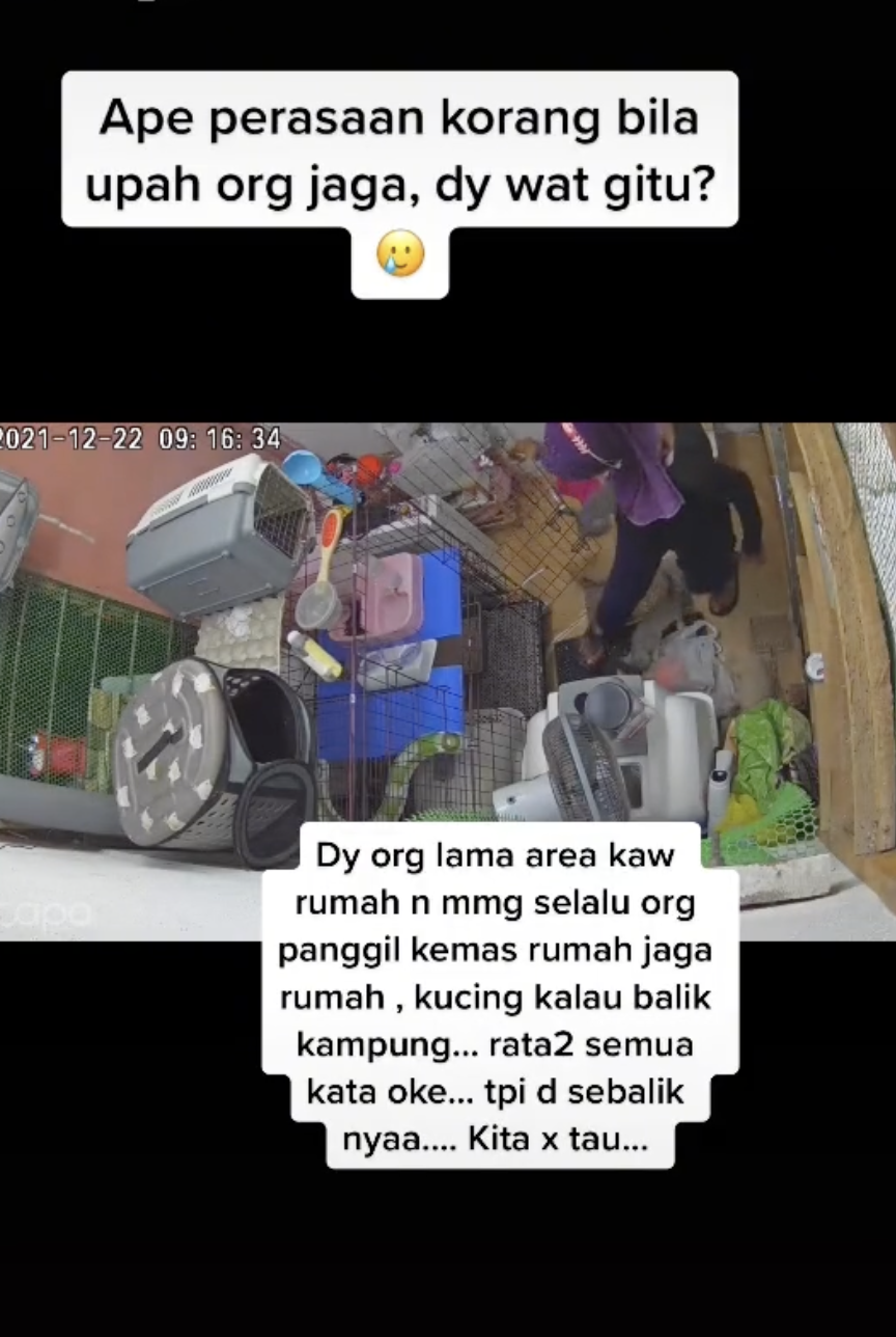 Individu itu dilihat mencampakkan kucing-kucingnya ke dalam sangkar. Menurut wanita itu, individu itu sudah lama tinggal di kawasan perumahan berkenaan dan ramai yang mengupahnya untuk mengemas rumah termasuklah menjaga kucing mereka.