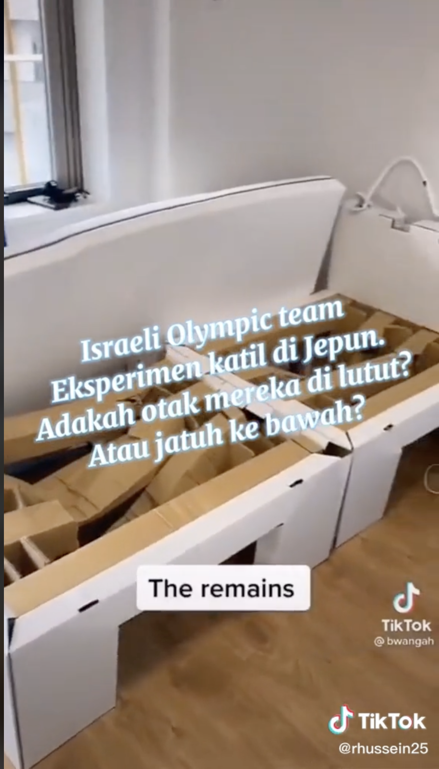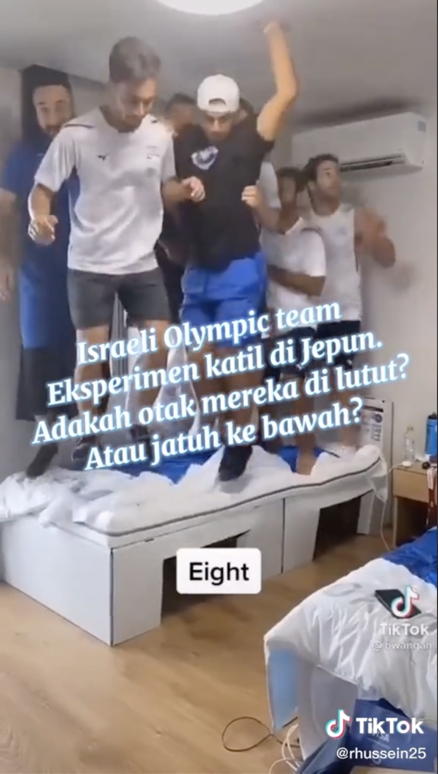 Menerusi video tersebut, kelihatan sekumpulan atlet daripada Israel mengambil keputusan dengan menguji ketahanan katil kadbod yang disediakan pihak tuan rumah itu.