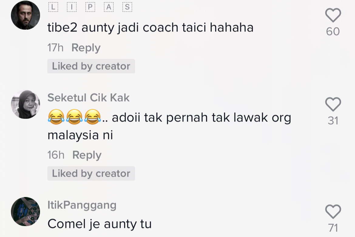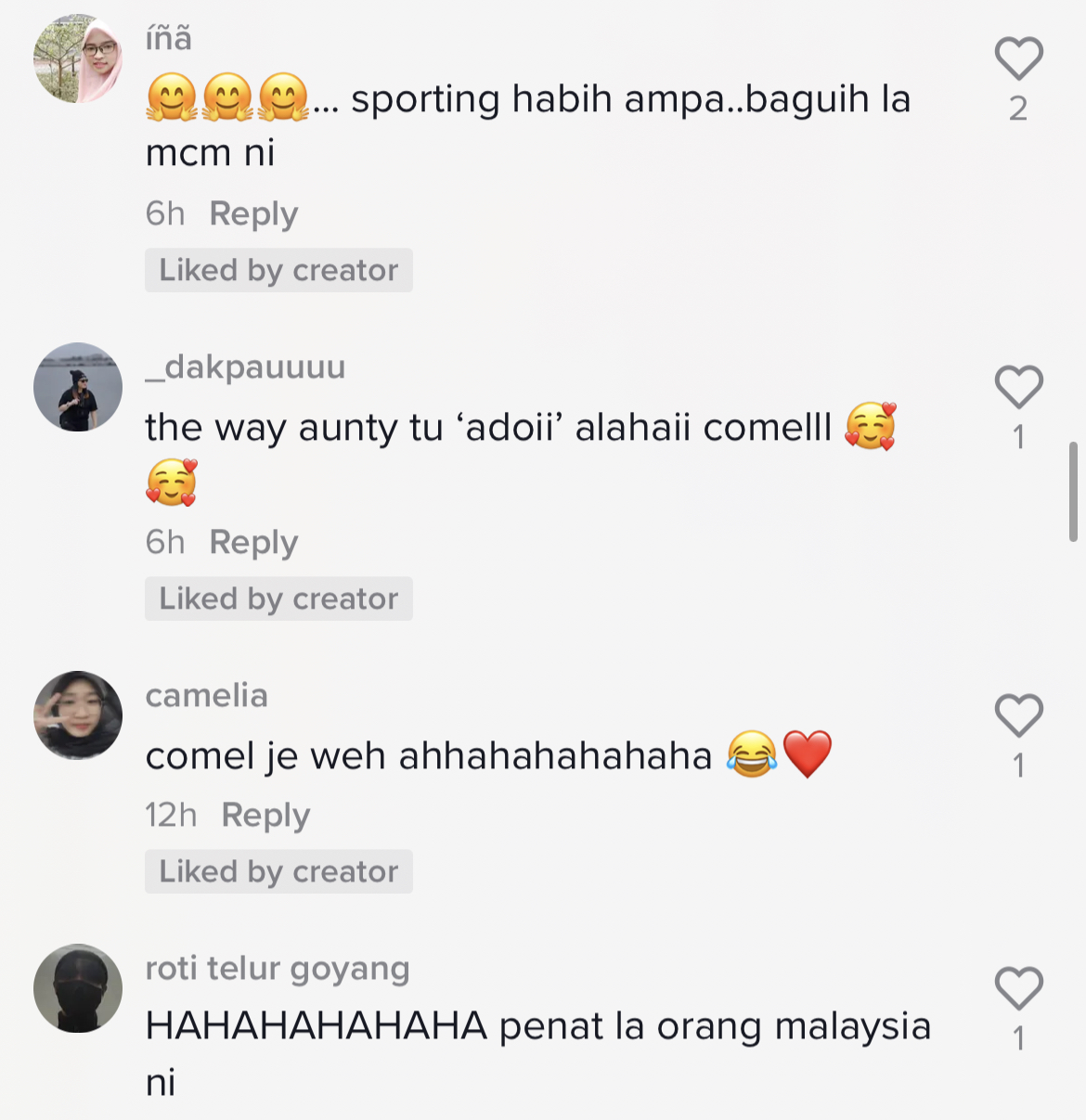 Tinjauan di ruangan komen pula mendapati rata-rata netizen turut terhibur melihat interaksi antara aunty Cina dan anak-anak muda berbangsa Melayu tersebut.