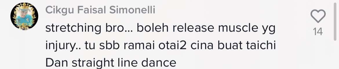 Namun, apa yang mencuit hati ramai adalah apabila tanpa dia sedari di belakangnya terdapat sekumpulan anak muda berbangsa Melayu yang turut mengikuti senaman tersebut.