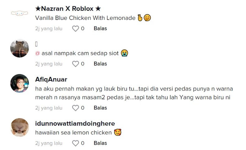 Apa yang menarik perhatian adalah lauk ayam berwarna biru yang kelihatan sama seperti minuman blue lemon. Dalam lauk itu juga dipaparkan terdapat banyak kepingan lemon dan kuah yang banyak.
